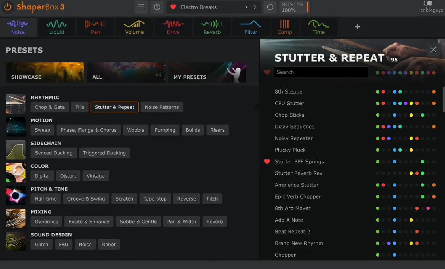ShaperBox 3 is a multi-effect modulation plugin from Cableguys. It combines a range of separate “Shapers” into one environment, including volume, filter, pan, width, drive, crush, noise, time, liquid, reverb, and pitch. The key idea is that you are not just loading an effect and leaving it static. You are shaping how that effect behaves over time using curves, syncing, triggers, and modulation.